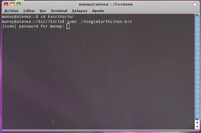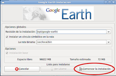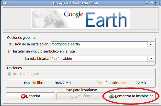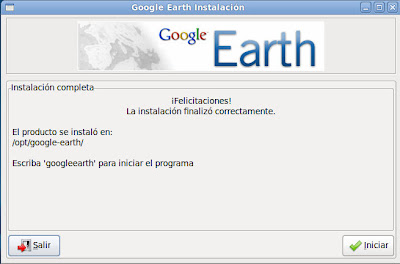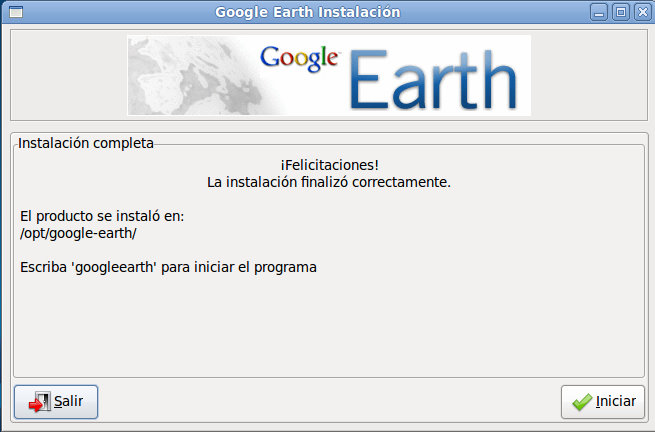 Ya tieness el programa instalado. Pulsa Salir para acabar la instalación o Iniciar si deseas ejecutar ya el programa. Puedes ejecutar el archivo en cualquier momento desde Aplicaciones > Internet > Google Earth.